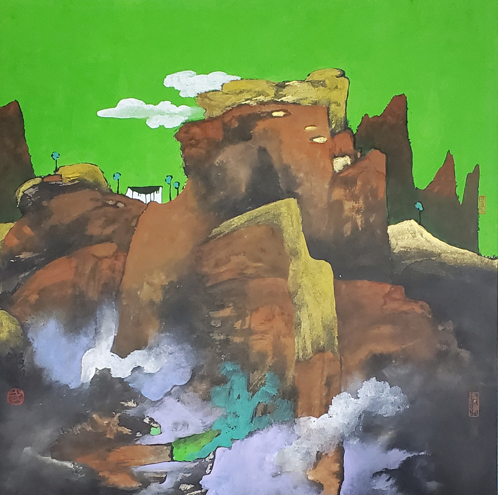 “积彩法”的传统性体现在武剑飞对中国画笔墨精神的尊重。他的笔触仍然保留了传统山水画中“留白”的构图理念,通过色彩的层次感来替代传统的水墨层次,使得作品在视觉上更加丰富,同时,他的构图依然遵循传统山水画中“疏密有致、虚实结合”的法则,通过色彩的积累构建出山水的形与势,让观者在沉浸于丰富色彩的同时,仍然能感受到中国画的意境与气韵。