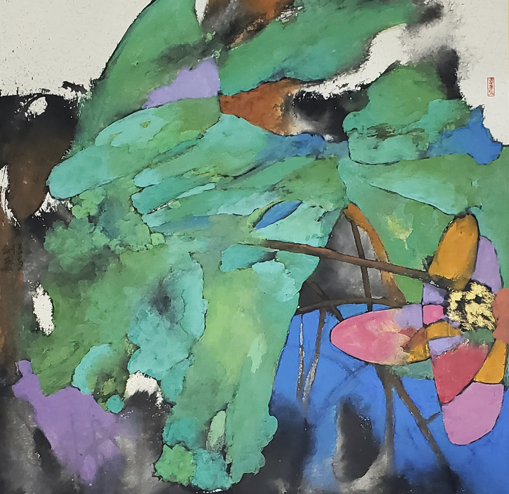 武剑飞的重彩画不仅深刻继承了中国传统绘画的精髓,还在形式和内容上大胆吸收了现代艺术的视觉观念,尤其是在构图与色彩的运用上,他巧妙地将西方现代绘画中的形式美学融入其中,赋予作品以更加鲜明的视觉表现力。这种东西方艺术理念的碰撞与融合,使武剑飞的作品既保持了中国画的写意精神与文化底蕴,又注入了现代艺术的创新元素,展现出强烈的个人风格。