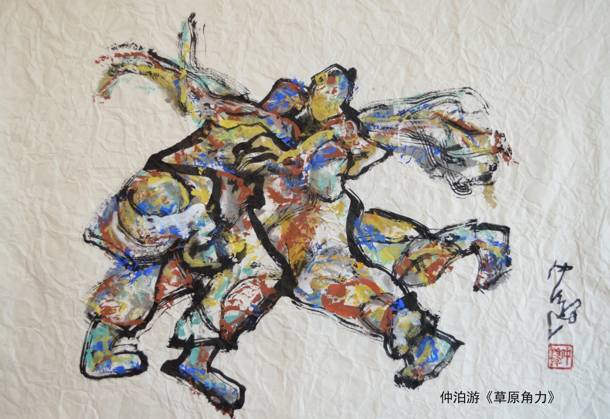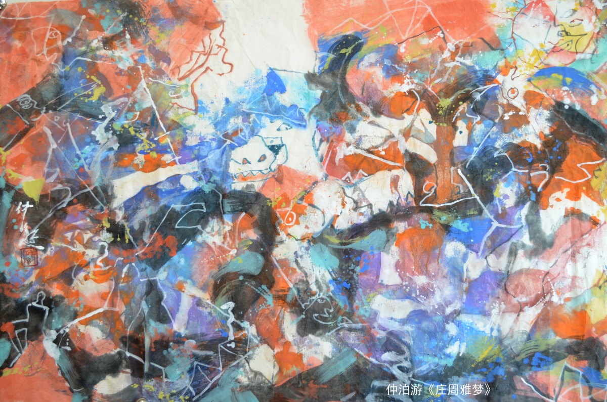 其次,仲泊游的重彩作品则充分展现了他对色彩的独到理解和运用。他不满足于传统水墨的黑白灰,而是大胆地运用鲜艳的色彩,通过色彩的对比和搭配,创造出富有视觉冲击力的画面效果,给人以深刻的印象。仲泊游在色彩的运用上,不仅追求视觉上的美感,更注重色彩所传达的情感和象征意义。他作品中的色彩不仅仅是表面的装饰,更是情感和思想的载体,通过色彩的巧妙运用,他能够将复杂的情感和深邃的思想表达的淋漓尽致。他的重彩作品多以表达远古神话居多,这些远古神话系列画作,以飞动的狂草线条,用具象与非象的虚幻语言,超乎形外,唱咏画家心中弦音般的乐府。而且通过对比色的运用,画面的立体感和层次感非常突出,不仅增加了画面的视觉冲击力,还赋予了作品更深的文化内涵。