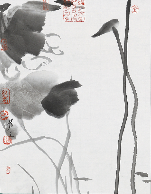 她的绘画构图不仅在山水画中展现出创新性,在花鸟画中也有所突破。她的部分作品采用局部特写的方式,使画面更具现代感。例如,荷花的描绘并未采用传统的对称式布局,而是通过不同角度的变换,使花朵与叶片形成错落有致的节奏,使画面更具动感。