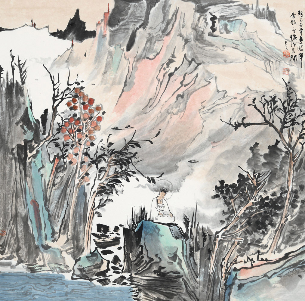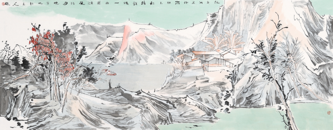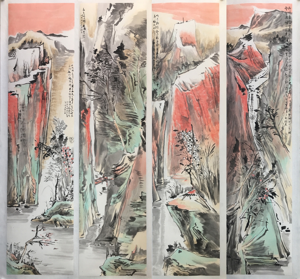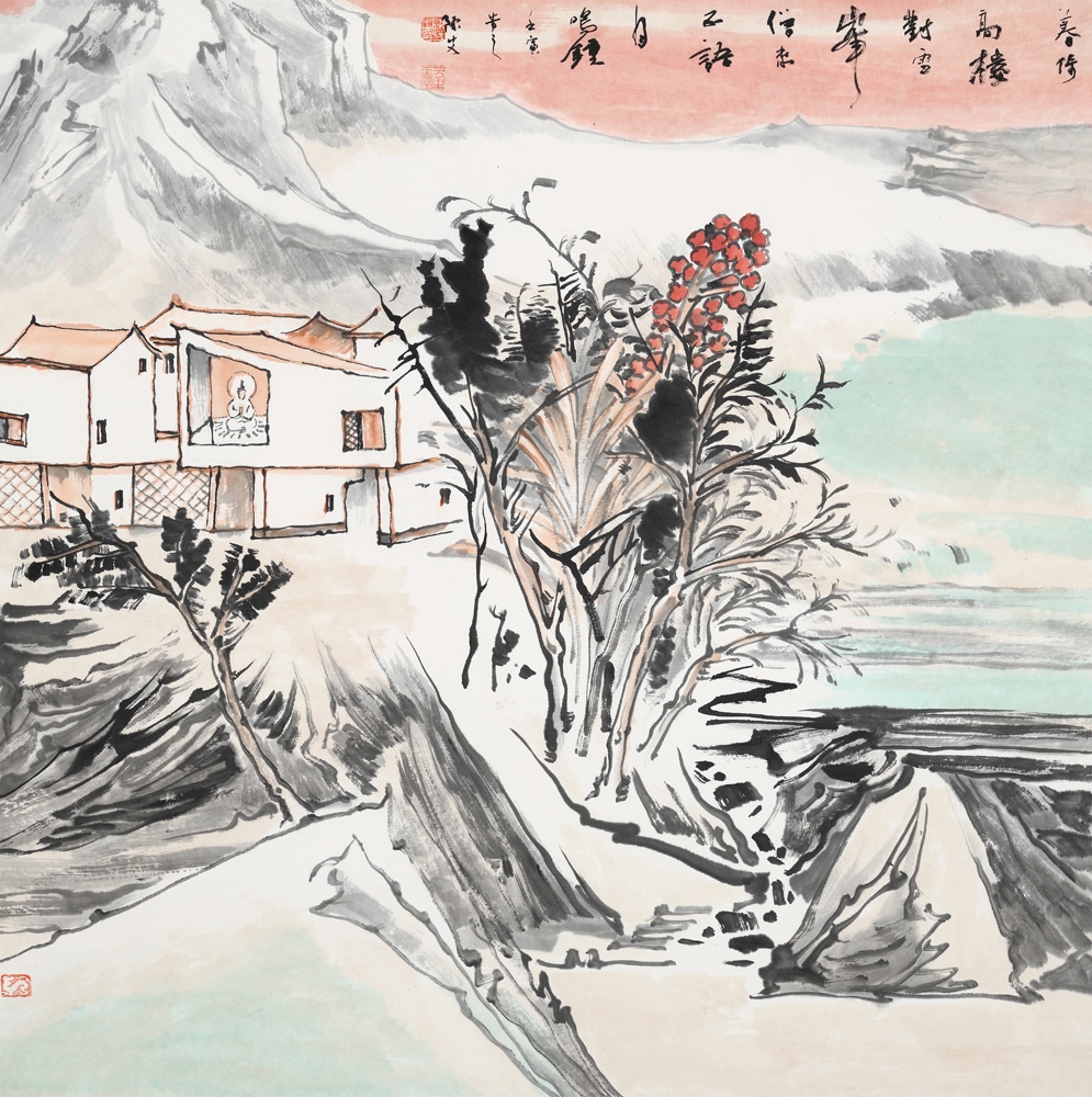 作品中的色彩运用带有鲜明的主观性,她在部分作品中大面积使用红、青、赭色,使画面在沉稳中透出鲜活的韵律。山体的描绘不同于传统水墨画中的皴法,而是通过色彩晕染,使山峦层叠之间既具有厚重的结构感,又呈现出通透的光感。红色的使用尤为大胆,部分山水作品中,天空或远山背景铺染一抹浓烈的朱砂红,使画面呈现出壮阔的意境,与传统山水画的清雅风格形成鲜明对比。
