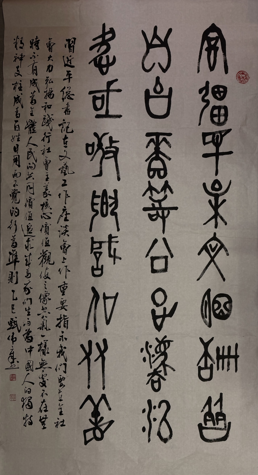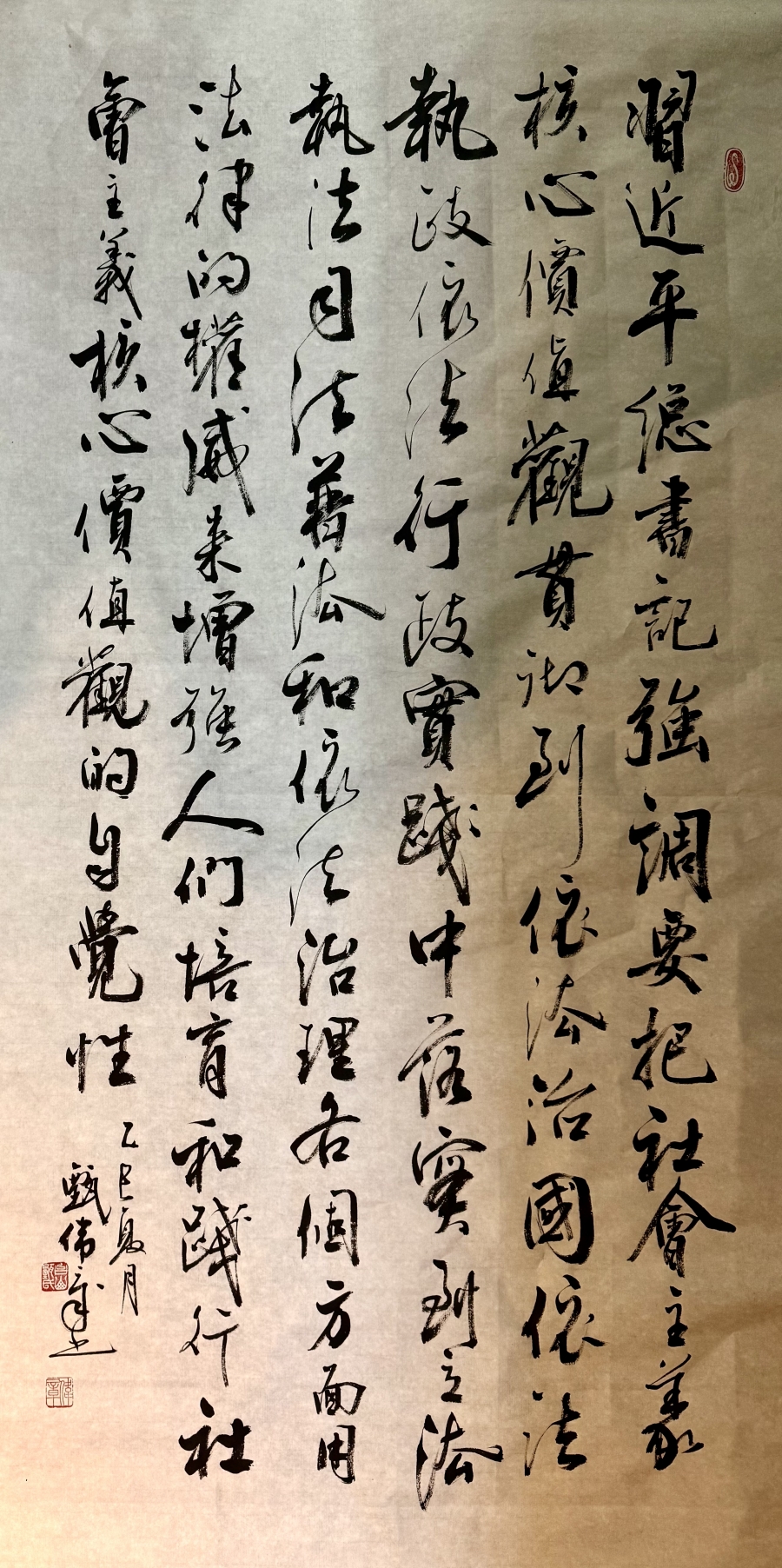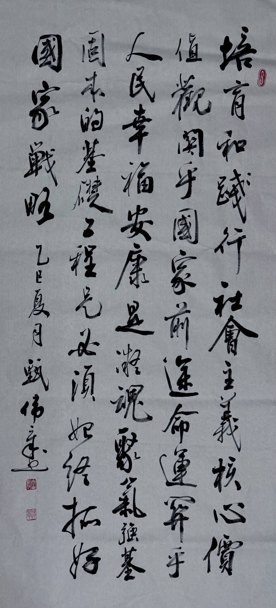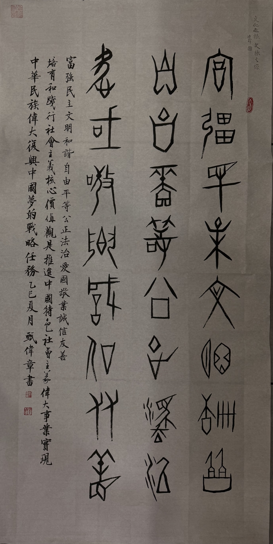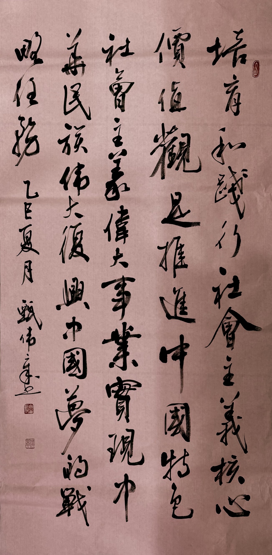 他还积极参与各类文化交流活动,创作了大量以社会主义核心价值观为主题的书法作品。这些作品或大气磅礴,或细腻温婉,通过不同的字体、风格,将24字核心价值观展现得淋漓尽致。无论是在本地的文化展览,还是与其他地区的文化交流中,这些作品都吸引了众多目光,让更多人在欣赏书法艺术的同时,深入了解社会主义核心价值观。