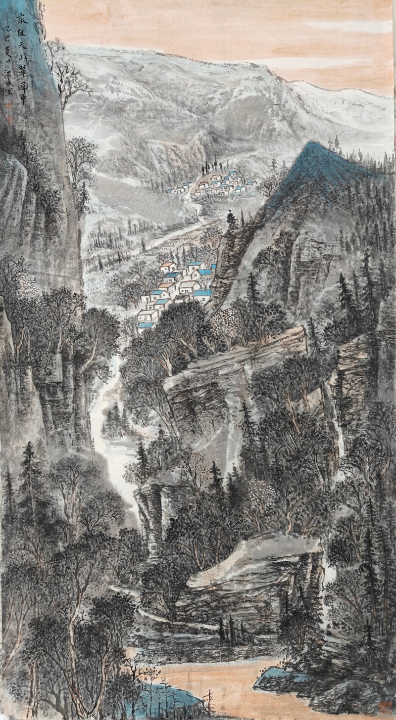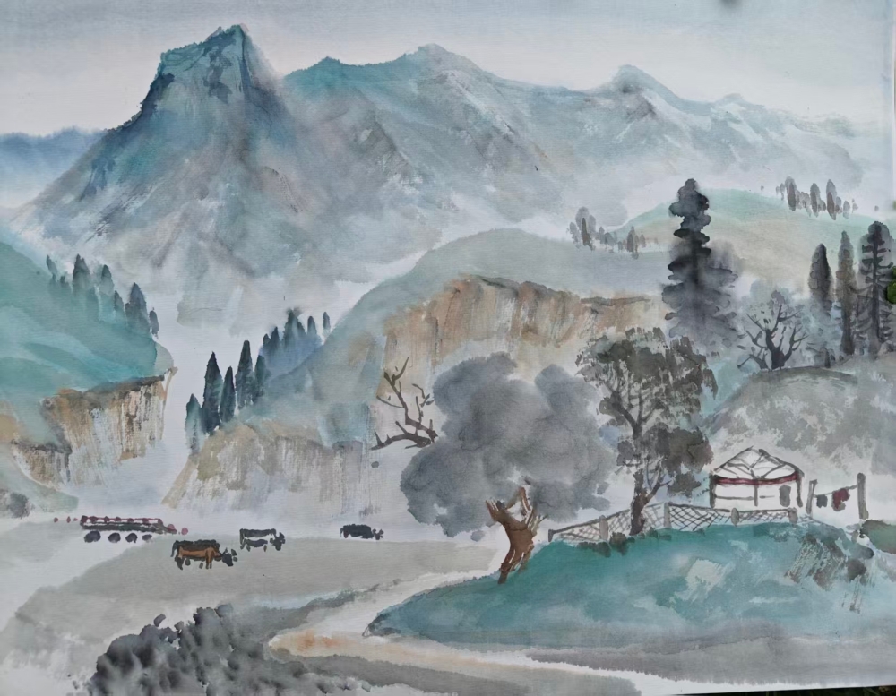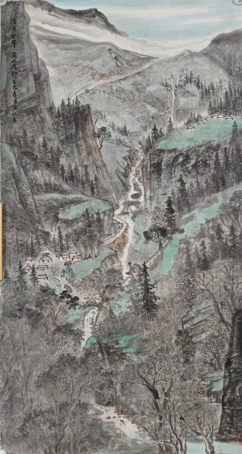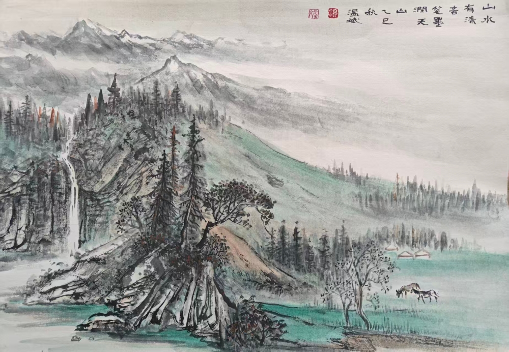 温斌的艺术启蒙根植于新疆广袤的土地。天山雪峰的巍峨、伊犁河谷的丰饶、边境生活的多样性,构成了他最初的美学记忆库。然而,他并未止步于地域性的视觉再现,而是远赴清华美院山水画高研班,系统研习祁恩进、朱零、张津诚等名家的笔墨语言与构图理念。这一教育经历使他获得了双重视野:一方面是边疆生活经验赋予的鲜活素材与情感连接,另一方面是传统山水画体系提供的技法支撑与美学框架。这种双重性使他能够超越简单的“地方风情画”,进入更为深刻的在地性美学建构。