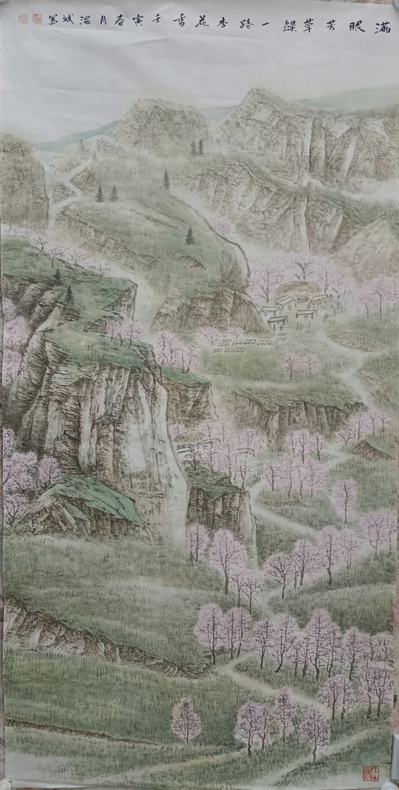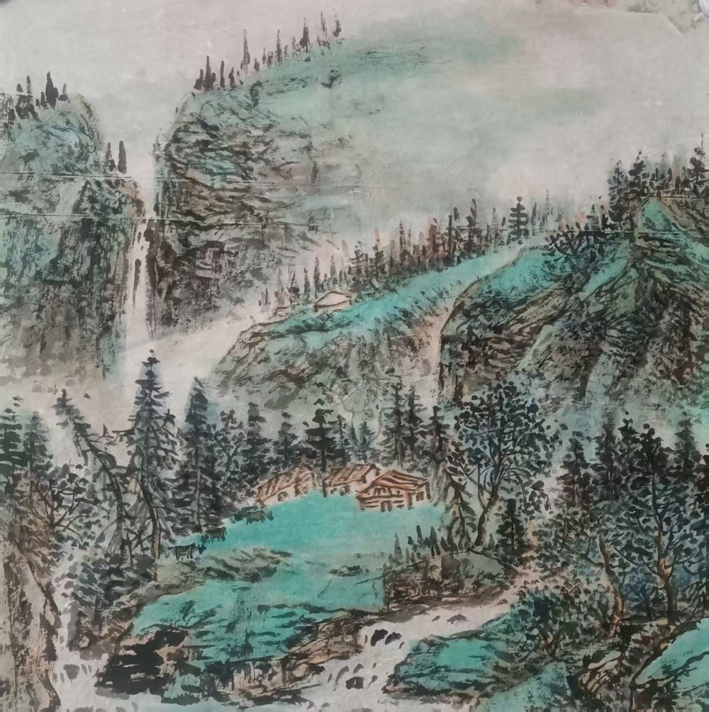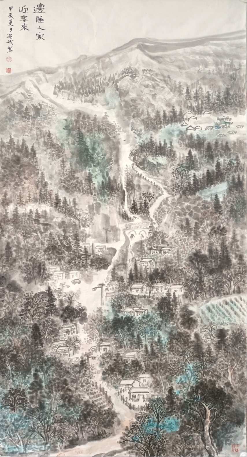 在《生态乡村入天山》《满眼芳草绿一路杏花香》等作品中,温斌展现了生态意识与传统山水精神的交融。他笔下的天山并非遥不可及的圣山,而是与人类生活和谐共存的生态空间。这种处理方式既承接了宋代山水“可居可游”的美学理想,又注入了当代的生态关怀。值得注意的是,温斌并未采用西方风景画的写实手法,而是运用传统山水画的散点透视与意境营造,创造出一种既真实又超越的边疆景观。这种创作方法表明,他并非简单地用国画技法描绘新疆风景,而是在进行一种语言转换——将边疆经验转化为山水画的美学词汇。