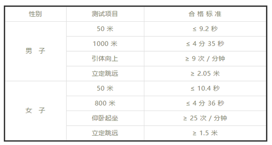 以上四个项目须全部进行测评。其中,有3个及以上达标的,体能测试结论为合格。