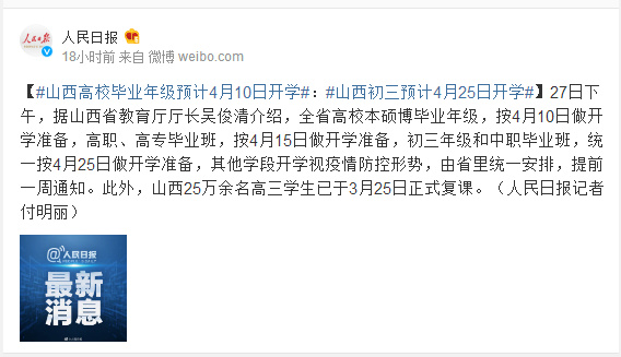 27日下午,据山西省教育厅厅长吴俊清介绍,全省高校本硕博毕业年级,按4月10日做开学准备,高职、高专毕业班,按4月15日做开学准备,初三年级和中职毕业班,统一按4月25日做开学准备,其他学段开学视疫情防控形势,由省里统一安排,提前一周通知。此外,山西25万余名高三学生已于3月25日正式复课。(人民日报记者付明丽)