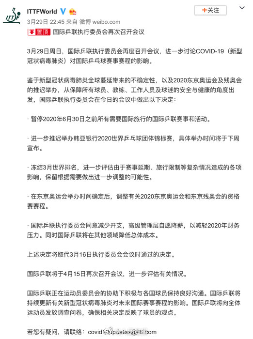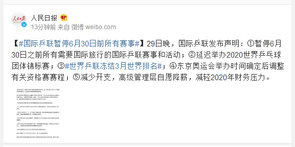 29日晚,国际乒联发布声明:①暂停6月30日之前所有需要国际旅行的国际乒联赛事和活动;②延迟举办2020世界乒乓球团体锦标赛;③#世界乒联冻结3月世界排名#;④东京奥运会举办时间确定后调整有关资格赛赛程;⑤减少开支,高级管理层自愿降薪,减轻2020年财务压力。
