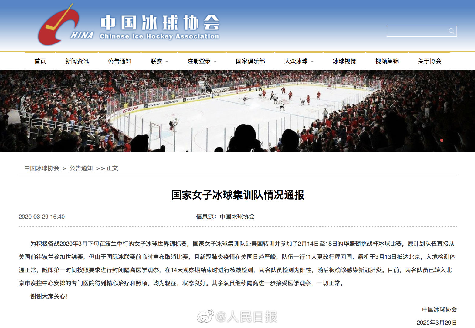 29日,中国冰球协会发布情况通报,两名国家女子冰球队队员确诊新冠肺炎,均为轻症。通报称,国家女子冰球集训队因国际冰联赛取消,新冠肺炎疫情在美国日趋严峻,3月13日归国抵京,入境检测体温正常,封闭隔离医学观察期结束时进行核酸检测,两名队员检测为阳性,随后被确诊感染新冠肺炎。