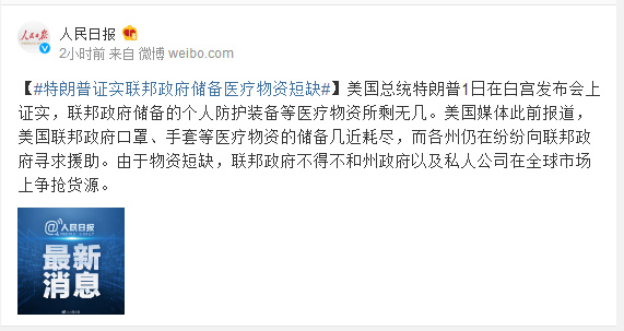 美国总统特朗普1日在白宫发布会上证实,联邦政府储备的个人防护装备等医疗物资所剩无几。美国媒体此前报道,美国联邦政府口罩、手套等医疗物资的储备几近耗尽,而各州仍在纷纷向联邦政府寻求援助。由于物资短缺,联邦政府不得不和州政府以及私人公司在全球市场上争抢货源。
