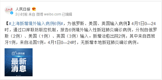 4月1日0—24时,通过口岸联防联控机制,报告6例境外输入性新冠肺炎确诊病例,分别自俄罗斯(2例)、美国(1例)、英国(3例)输入。新增治愈出院2例,其中来自西班牙1例,来自法国1例。4月1日0—24时,无新增本地新冠肺炎确诊病例。