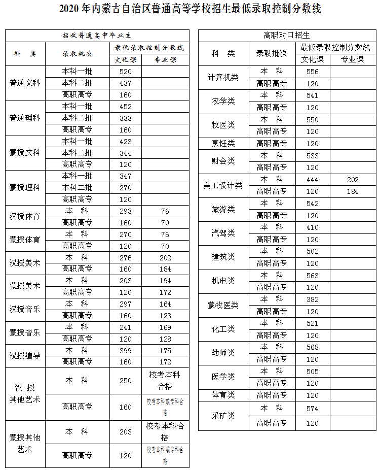 经内蒙古自治区招生考试委员会7月23日全体会议审议通过,现将2020年内蒙古自治区普通高等学校招生最低录取控制分数线公告如下: