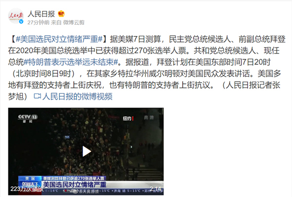 【#美国选民对立情绪严重#】据美媒7日测算,民主党总统候选人、前副总统拜登在2020年美国总统选举中已获得超过270张选举人票。共和党总统候选人、现任总统#特朗普表示选举远未结束#。据报道,拜登计划在美国东部时间7日20时(北京时间8日9时),在其家乡特拉华州威尔明顿对美国民众发表讲话。美国多地有拜登的支持者上街庆祝,也有特朗普的支持者上街抗议。(人民日报记者张梦旭)