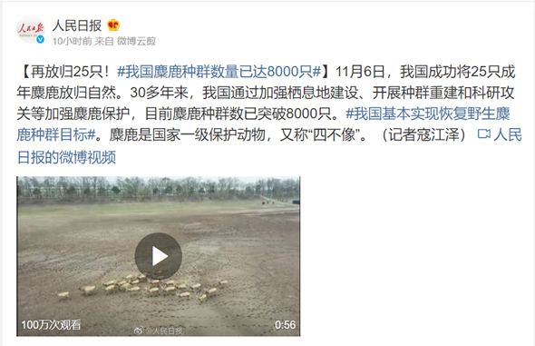 【再放归25只!#我国麋鹿种群数量已达8000只#】11月6日,我国成功将25只成年麋鹿放归自然。30多年来,我国通过加强栖息地建设、开展种群重建和科研攻关等加强麋鹿保护,目前麋鹿种群数已突破8000只。#我国基本实现恢复野生麋鹿种群目标#。麋鹿是国家一级保护动物,又称“四不像”。(记者寇江泽)
