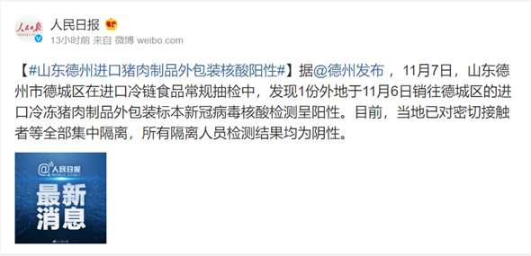 【#山东德州进口猪肉制品外包装核酸阳性#】据@德州发布 ,11月7日,山东德州市德城区在进口冷链食品常规抽检中,发现1份外地于11月6日销往德城区的进口冷冻猪肉制品外包装标本新冠病毒核酸检测呈阳性。目前,当地已对密切接触者等全部集中隔离,所有隔离人员检测结果均为阴性。