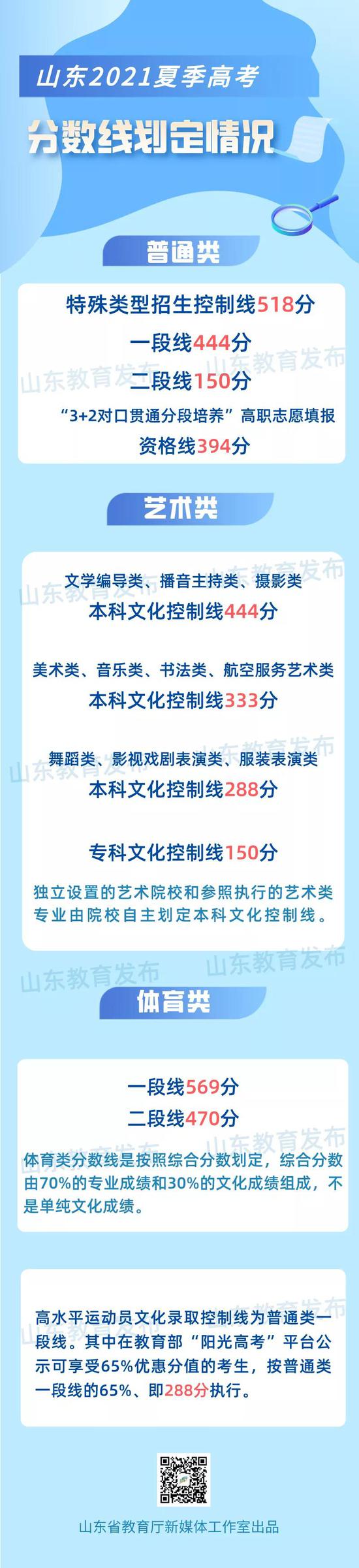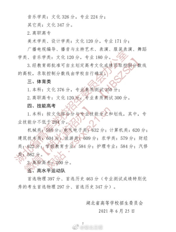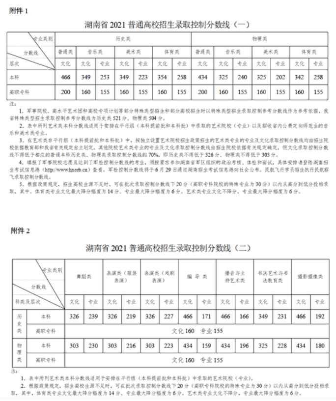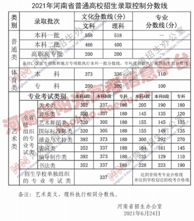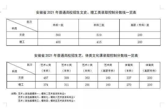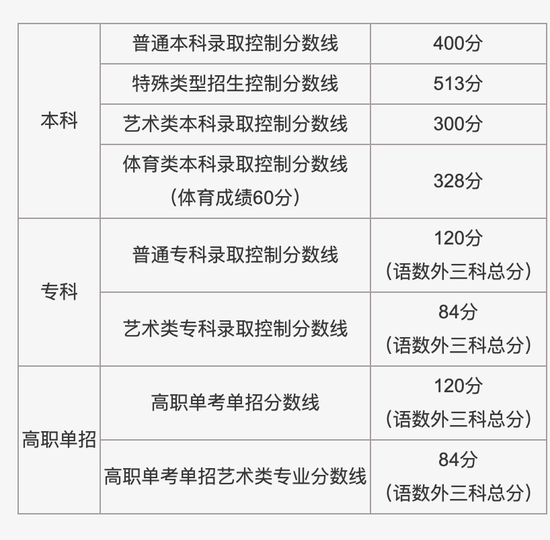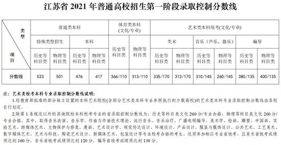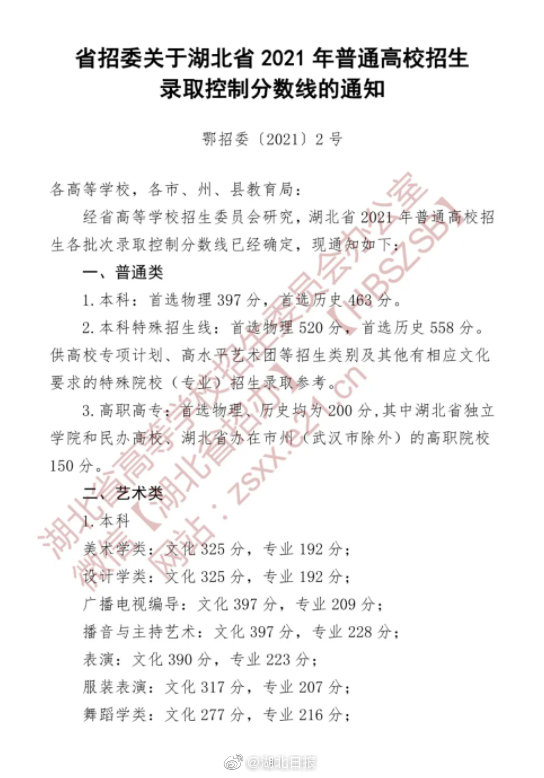 2021年普通高考艺术类、体育类本科批次录取控制分数线确定。艺术类(不含戏剧与影视学类):324分;艺术类(戏剧与影视学类):463分;体育类:446分。