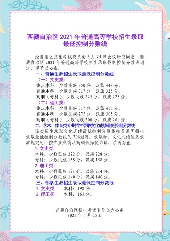 黑龙江省2021年全国普通高校各类招生录取最低控制分数线现公布如下: