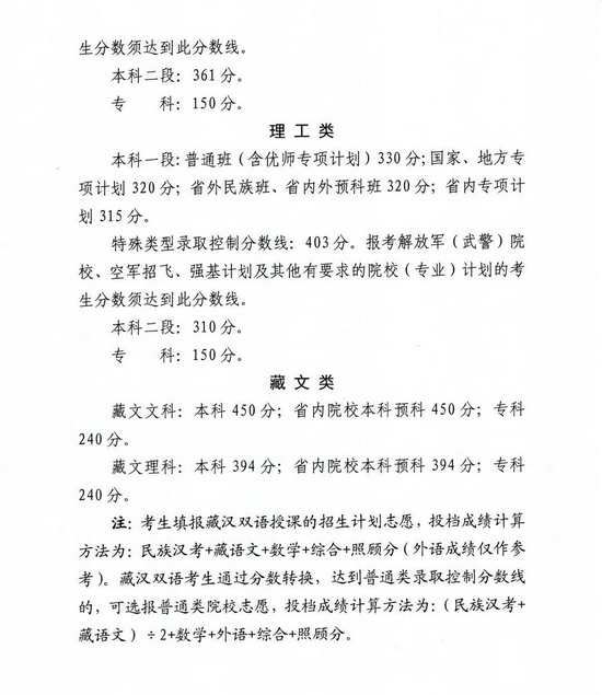 (二)理工类:第一批为505分;第二批为410分。