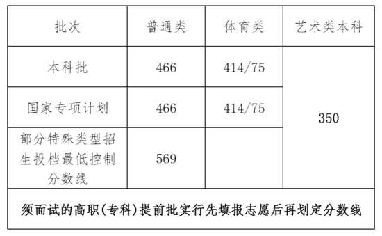 文科文化课为265分,理科文化课为210分。艺术类本科全省统考专业课最低录取控制分数线,将于艺术类提前批次录取后划定发布。