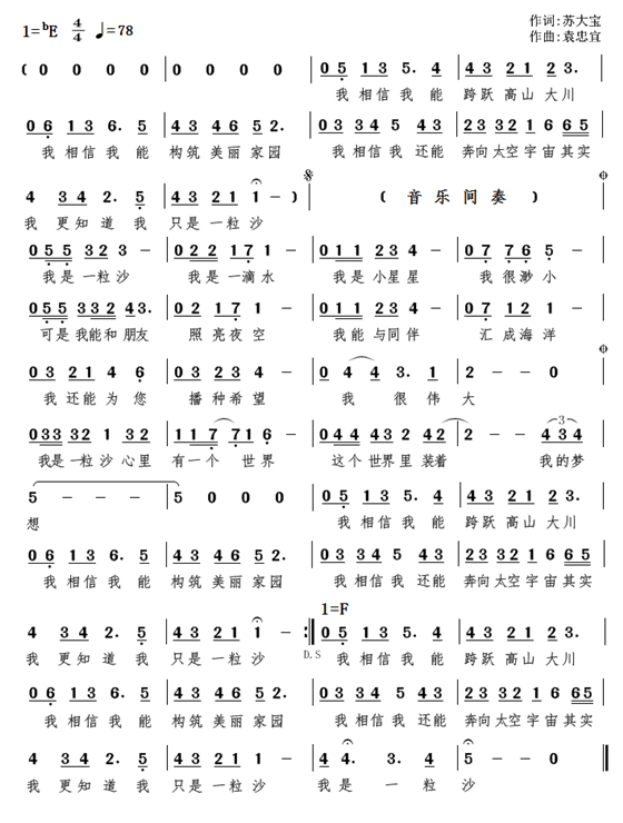 童声独唱《我是一粒沙》是一首旋律优美、结构简洁、感情真挚,具有强烈艺术感染力的童声佳作。天真、朴实、甜美、童趣、很走心。尤其是结束句的落音在调式属音上,给人以意犹未尽的感觉,充分表达了“我是一粒沙,我有我的梦想”的音乐意境。总之,这是一首难得的好歌。