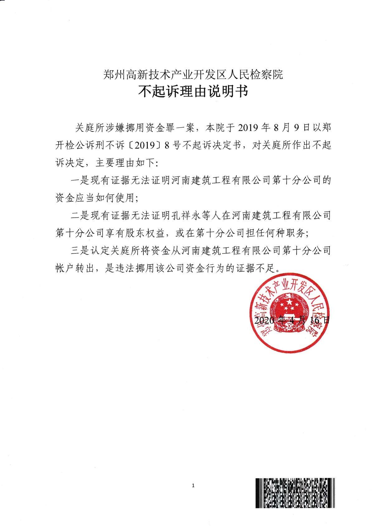 图:郑州高新区人民检察院对关庭所不起诉的理由说明书。