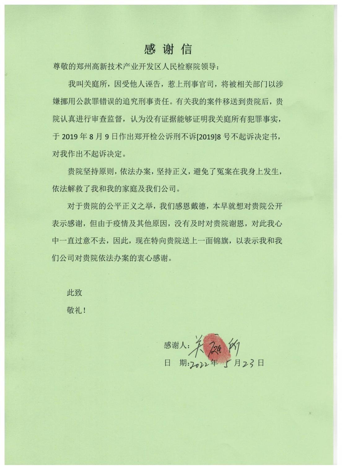 图:关庭所写给郑州高新区检察院的感谢信。
