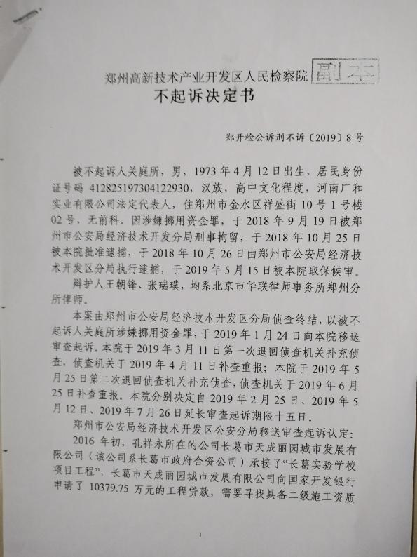 关庭所告诉媒体,2018年间,因受诈骗国开银行不法分子的诬告,他被某公安机关追究刑事责任执行羁押,案件移送到郑州高新区检察院,检察官们在对案件进行审查时,发现侦查机关所认定的事实不清,证据不足,关庭所缺乏构成犯罪的事实。于是,郑州高新区检察院作出郑开检公诉刑不诉[2019]8号不起诉决定书,并且还作出不起诉理由的说明书,依法解除了侦查机关对关庭所的刑事羁押,使关庭所避免了冤狱之灾,打破了不法分子对关庭所诬告的阴谋。