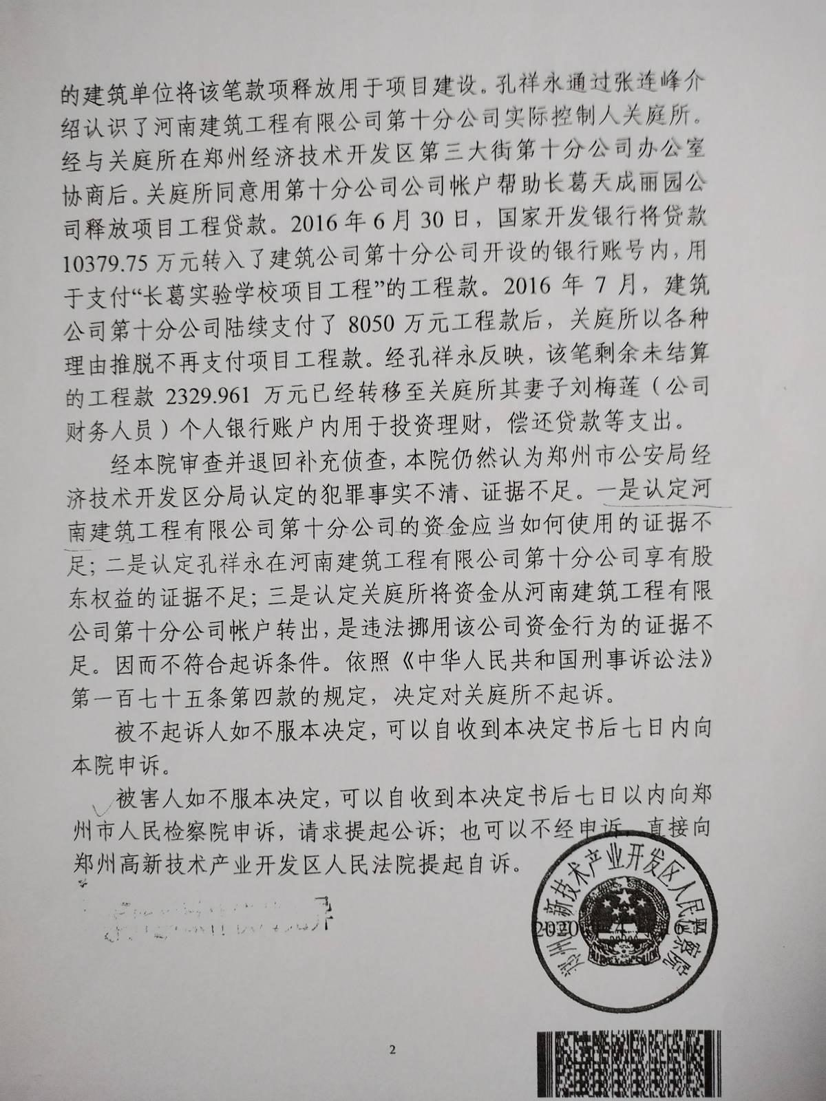 上两图:郑州高新区人民检察院对关庭所不起诉的决定书。